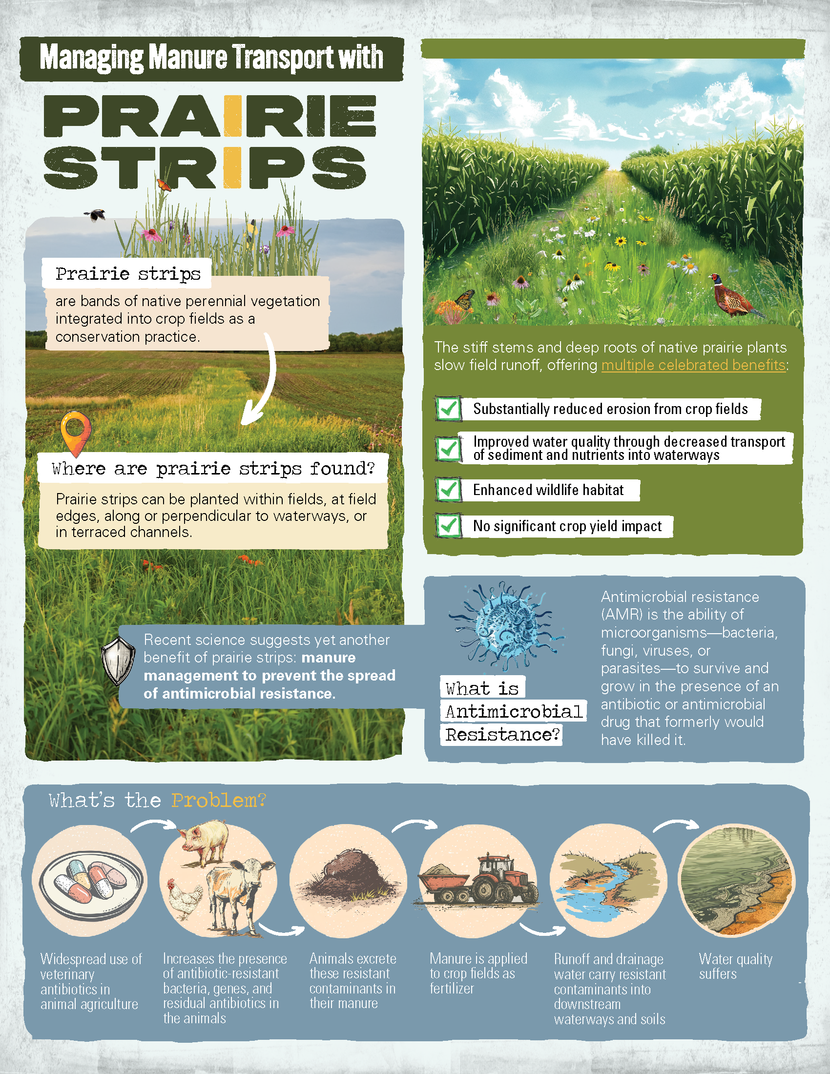 Managing Manure Transport with Prairie Strips Managing Manure Transport with Prairie StripsRecent science suggests yet another benefit of prairie strips: manure management to prevent the spread of antimicrobial resistance. Download PDF Soil Conservation, Conservation Crops, Water ConservationLiz RipleyJuly 29, 2025 Facebook0 Twitter 0 Likes